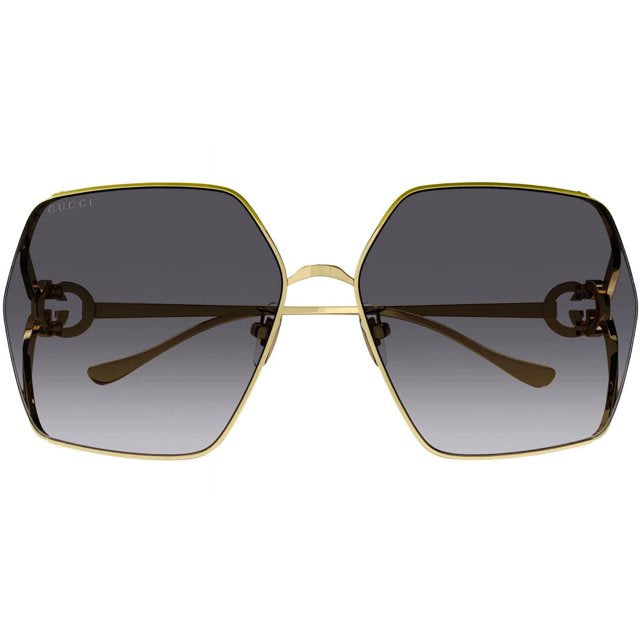 Step into bold elegance with the Gucci GG1322SA‑001 64 sunglasses. This women’s model features a sumptuous full‑rim gold‑tone metal frame in a striking oversized square silhouette, paired with grey...