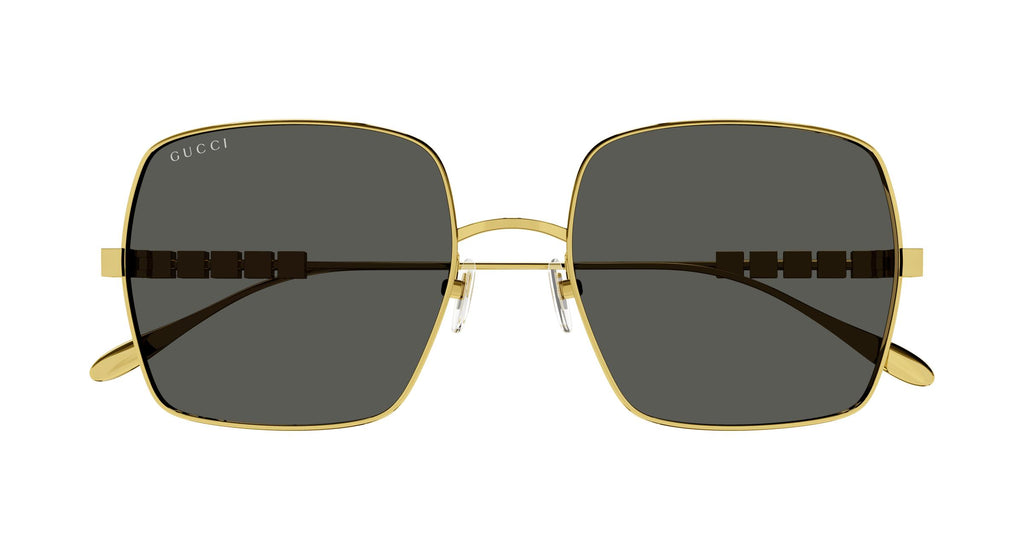 Elevate your look with the GG1434S‑001 57 from Gucci. This women’s sunglasses model features a striking oversized square silhouette crafted from premium metal in a polished gold tone (colour...